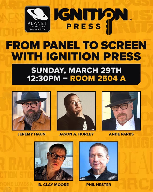 This newsletter drops a day before Planet Comicon starts, in downtown Kansas City. I’ve been doing the show almost since day one, and being a part of its incredible growth has been fun and gratifying. The coming weekend features major cons in Chicago and on the West Coast, but Planet remains a locally owned and operated venture (shoutout Chris Jackson!), and with so many Midwestern creators on their roster (along with yours truly, Dennis Hopeless, Jeremy Haun, Jason Hurley, Cullen Bunn and Ande Parks are all KC/Missouri guys, and Phil Hester might as well be), it was great to learn that Ignition Press was coming to the show. I’ll be among the creators tabling with them (table 3748).